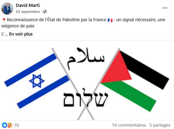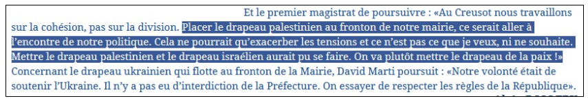 Pire, D. Marti s’était dit davantage favorable à l’idée d’arborer les drapeaux palestinien et israélien côte à côte ce même jour ! Sur le même plan, le colon et le colonisé, la victime et son bourreau… Imagine-t-on le drapeau russe flotter aux côtés du drapeau ukrainien, fermement accroché au fronton de notre mairie depuis des années ? Tout partisan de la paix se doit de fustiger un tel deux poids deux mesures.