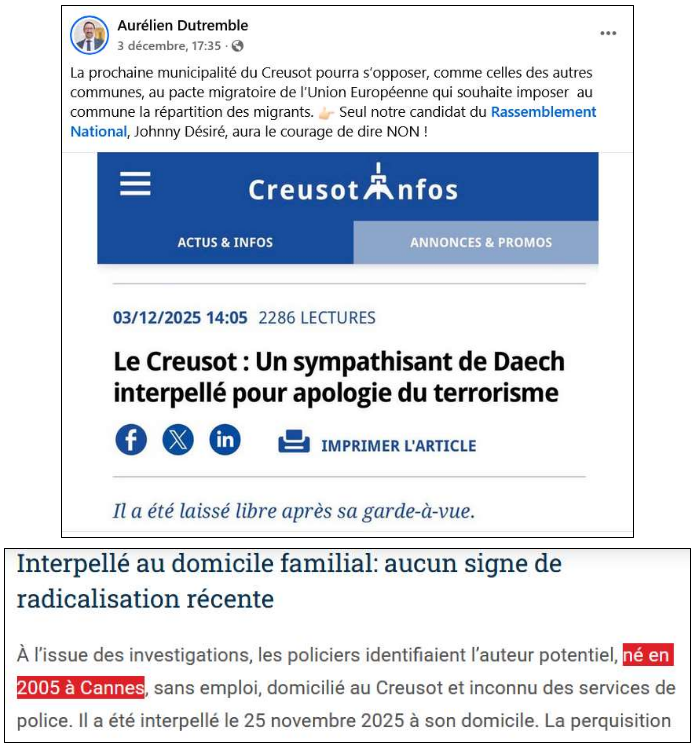 Du reste, entre une liste menée par un fervent soutien de la macronie ou celle aspirant à faire progresser localement les obsessions racistes et xénophobes du RN (voir exemple ci-dessous), pour mieux masquer leur soutien aux milliardaires et aux grandes entreprises, comme le démontrent leurs votes à l’Assemblée nationale… y a-t-il vraiment besoin d’y apporter le moindre crédit ?